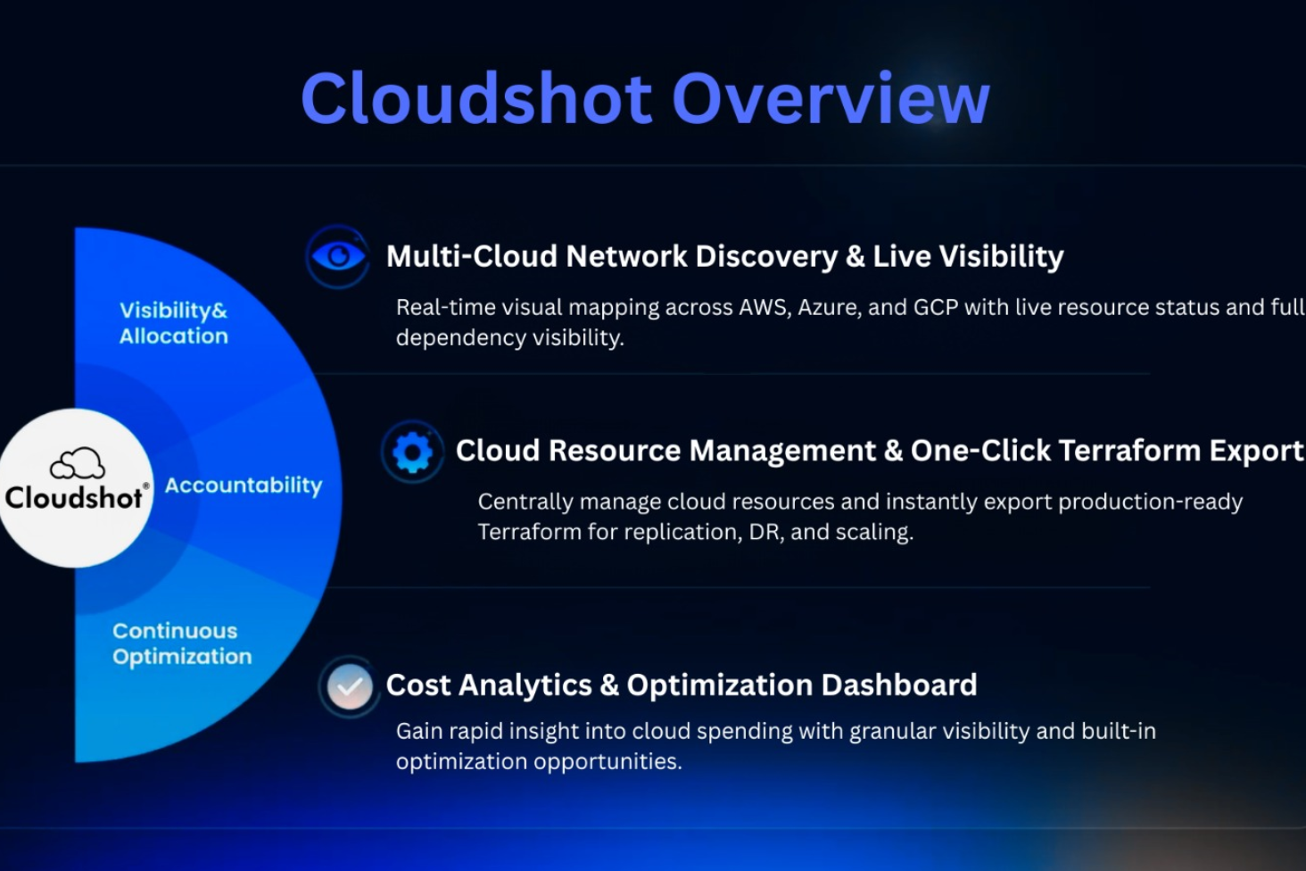 90% of multi-cloud teams still struggle with visibility across AWS, Azure, and GCP. Learn how Cloudshot unifies dashboards, detects drift, and enables real-time clarity for all stakeholders.